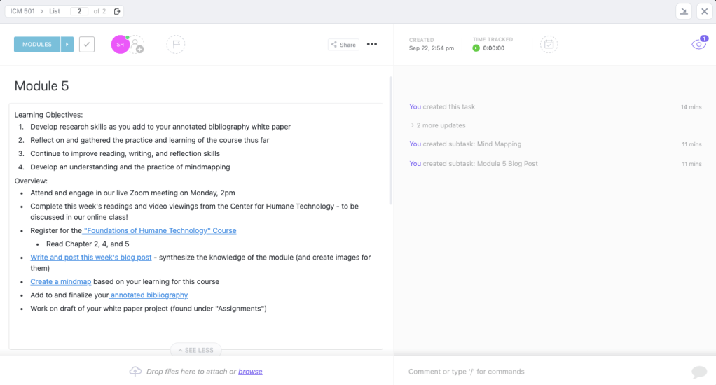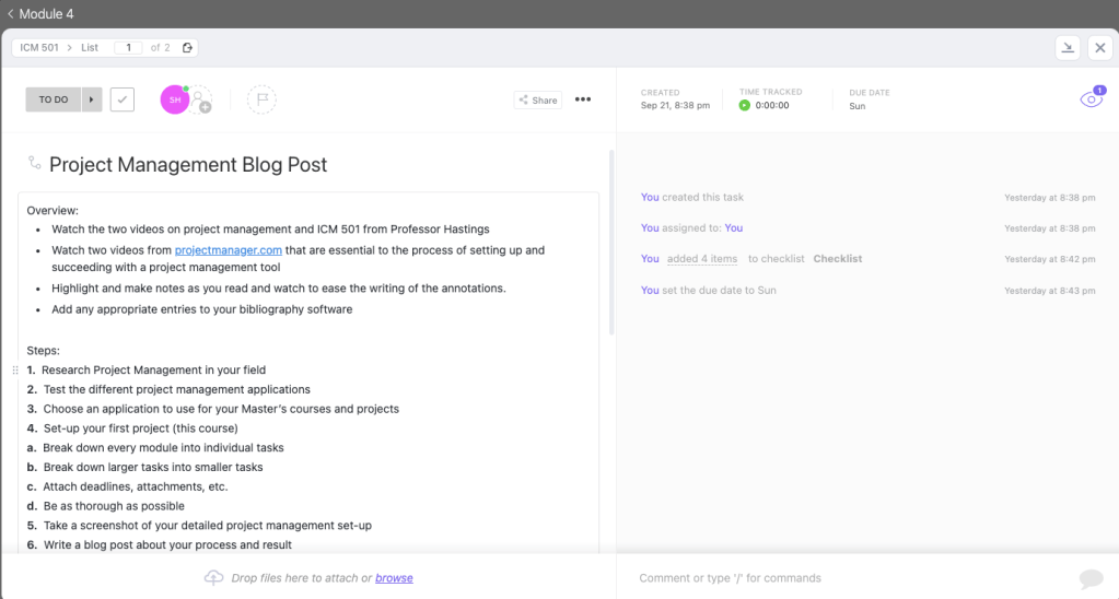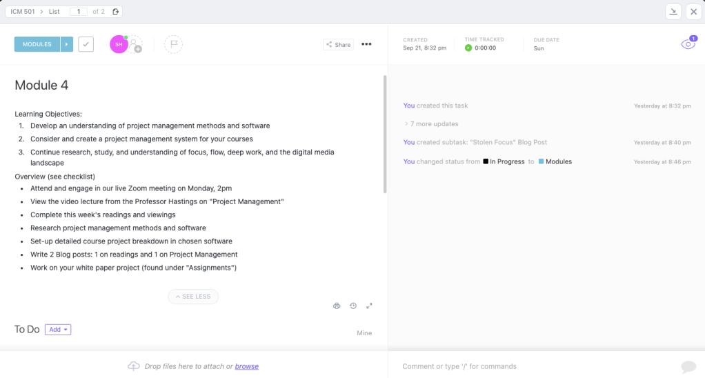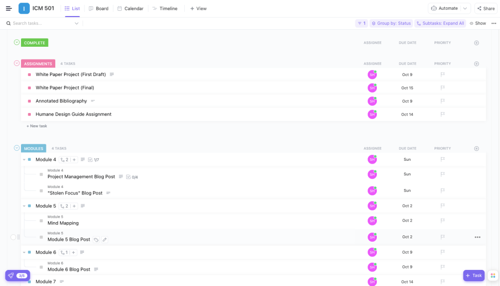 This past week, I translated these project management tools to be usable for my ICM 501 class. I began by creating a space called “ICM 501,” in which there would be three different statuses: modules, assignments, and “complete.” Everything has a due date, which is essential.